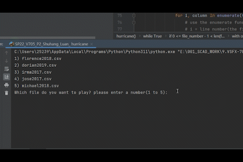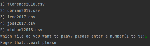 # set position,wind_speed,category: # coordinates =(Lon, Lat) position = float(column[3]), float(column[2]) category = column[-1][:-1] wind_speed = column[4][:-3] # group a new data(csv) data.append([position, category, wind_speed])